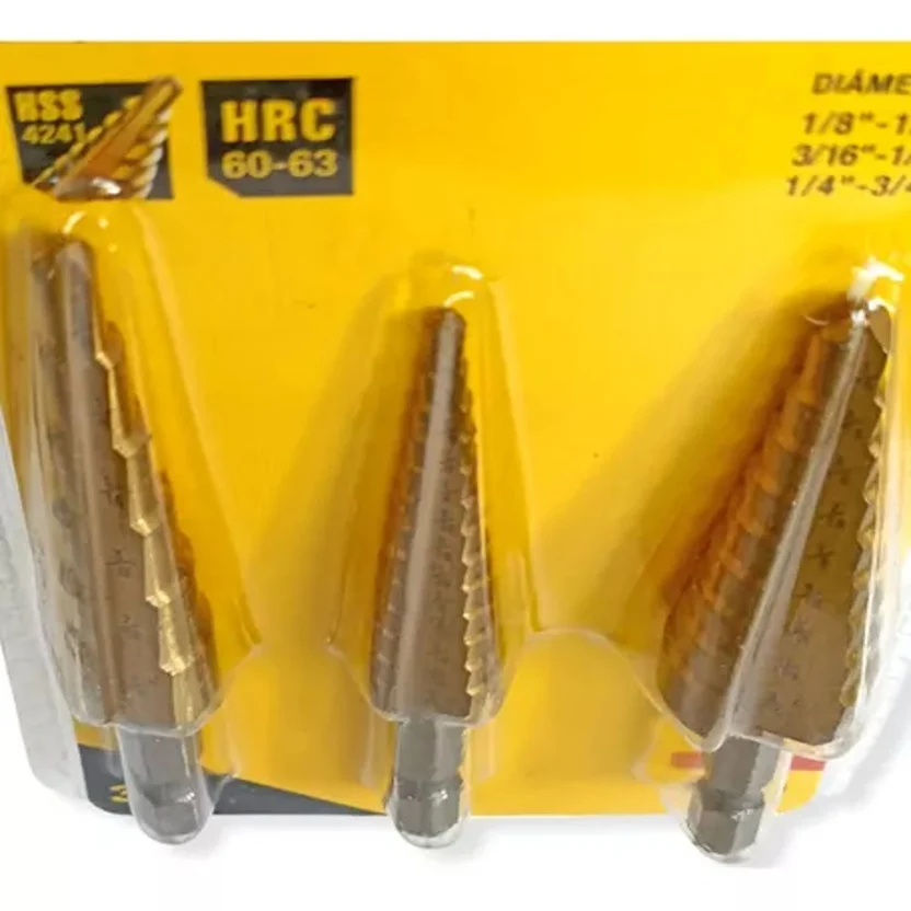 - Juego de brocas escalonada 3 piezas diseñadas para ofrecer versatilidad en tus perforaciones.